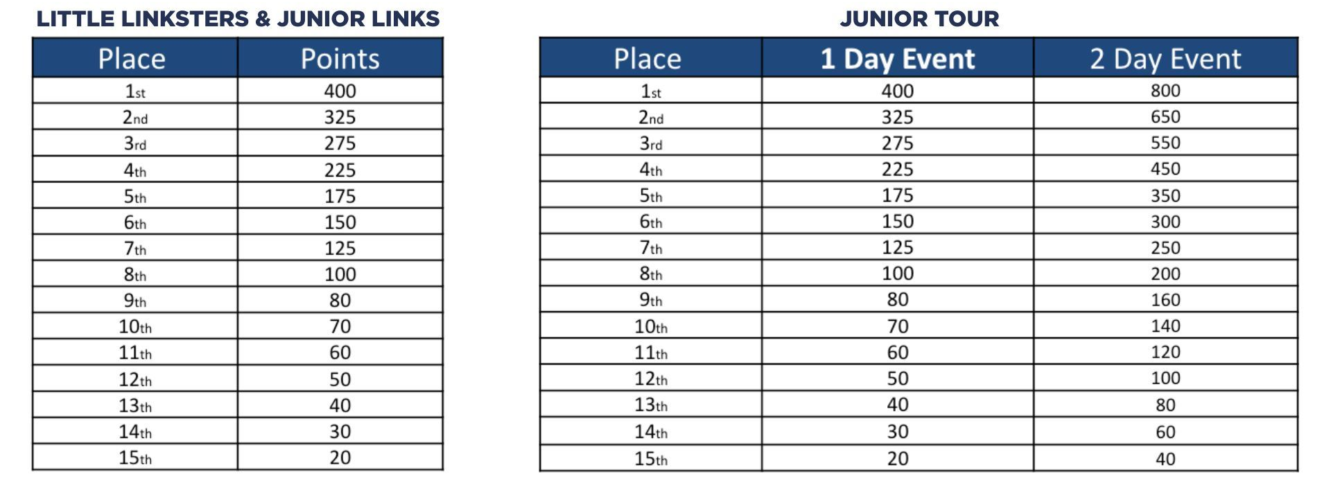 - At all one day events, medals will be awarded to 1st–3rd place finishers for the Junior Tour, Little Linksters, and Junior Links tours.